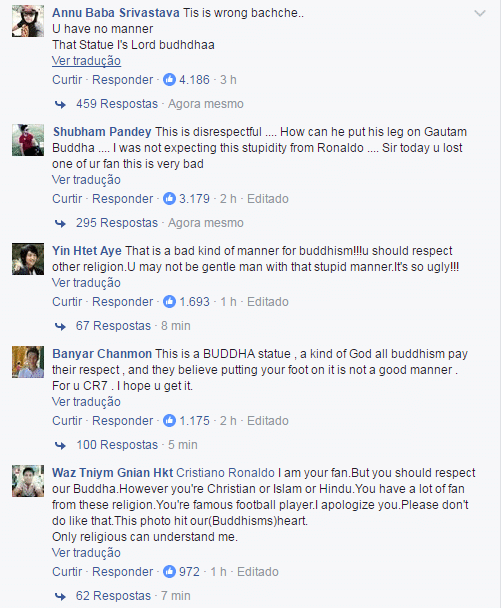 “Cristiano Ronaldo, sou seu fã, mas você deve mostrar respeito ao nosso Buda. Seja você cristão, muçulmano ou hindu. Você tem muitos fãs dessa religião. Eu te desculpo. Por favor não faça isso, essa foto machucou nosso (budistas) coração”, escreveu um usuário decepcionado.